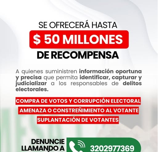 Las autoridades recordaron que las denuncias pueden realizarse a través de la línea telefónica 320 297 7639, habilitada para recibir información relacionada con posibles hechos que atenten contra la transparencia de las elecciones.