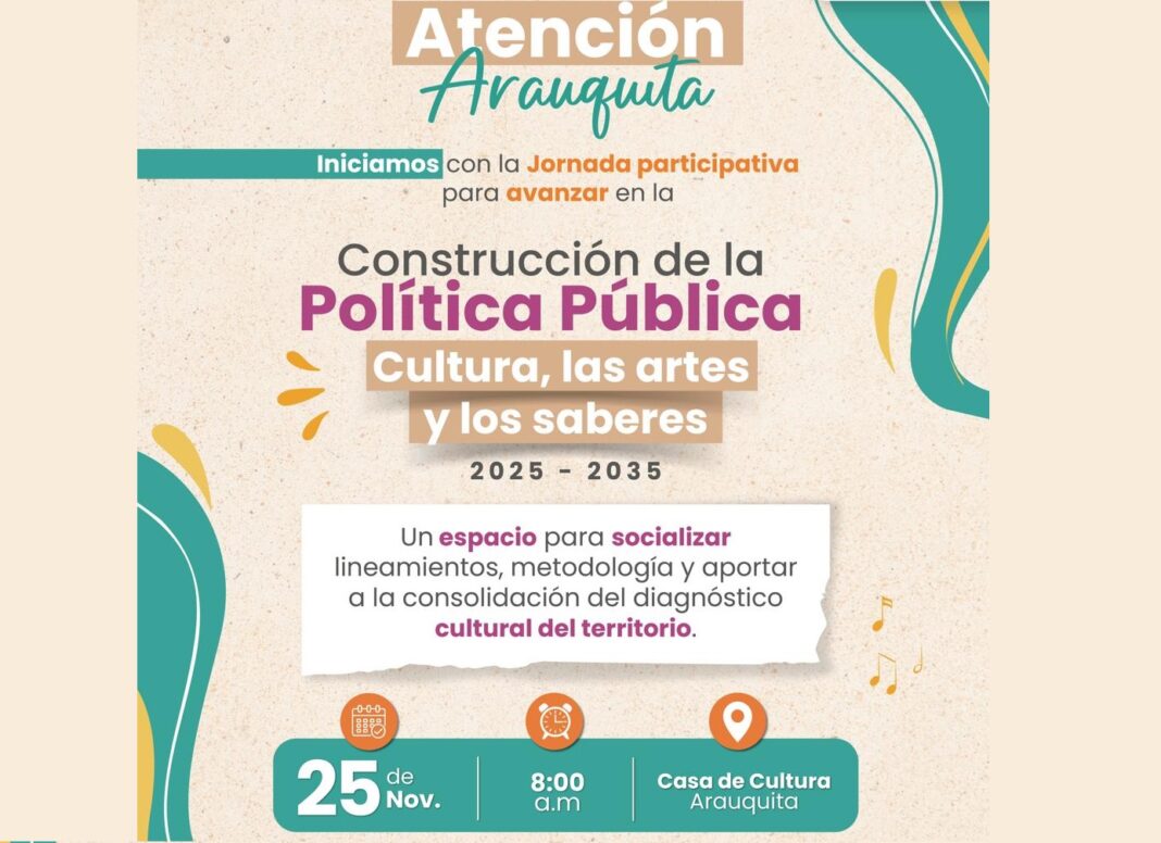 La Gobernación de Arauca, a través de la Oficina Asesora de Cultura y Turismo, anunció el inicio de las jornadas municipales que acompañarán la formulación de la Política Pública de Cultura, las Artes y los Saberes 2025–2035. La convocatoria está dirigida a actores culturales, instituciones, colectivos, gestores, artistas, portadores de tradición y ciudadanía en general.