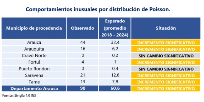 A nivel municipal, se evidenció un incremento por encima de lo esperado en Arauca (44 casos), Saravena (21), Arauquita (16) y Tame (13).