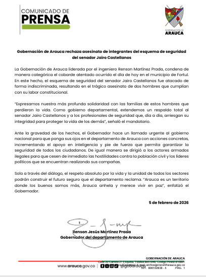 “Expresamos nuestra más profunda solidaridad con las familias de estos hombres que perdieron la vida. Como Gobierno departamental, extendemos un respaldo total al senador Jairo Castellanos y a los profesionales de la seguridad que, día a día, arriesgan su integridad para proteger a los demás”, manifestó el gobernador Renson Martínez Prada.