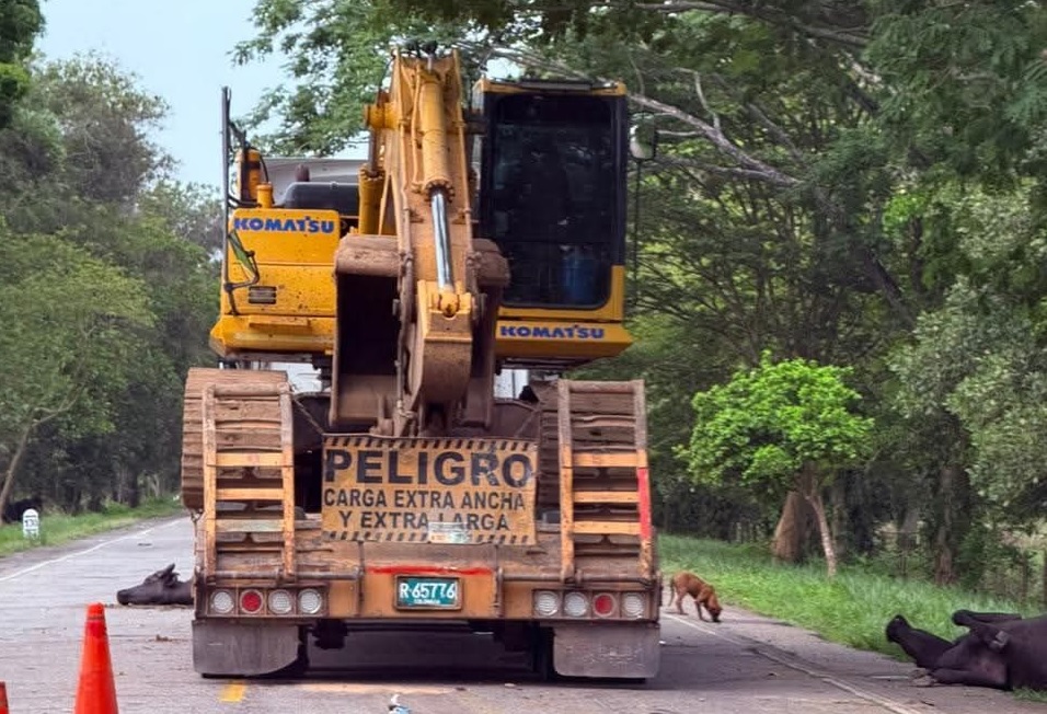 Según versiones preliminares, una cama baja que transportaba una retroexcavadora arrolló a un lote de búfalos que se encontraba sobre la carretera, generando el fuerte impacto.