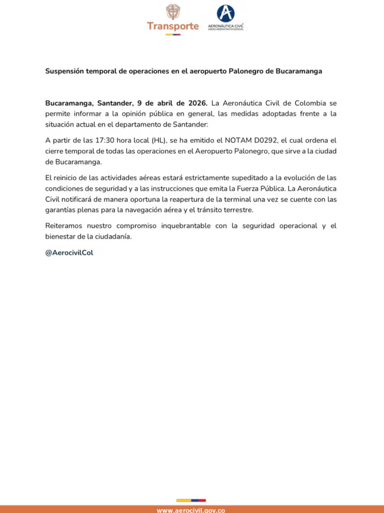 La Aeronáutica Civil ordenó la suspensión de operaciones en el aeropuerto Palonegro de Bucaramanga mediante la emisión de un NOTAM desde las 5:30 de la tarde, por condiciones de seguridad que afectan la operación aérea en la región.