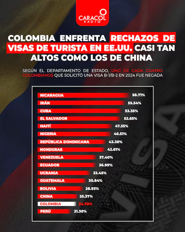 De acuerdo con el reporte del año fiscal 2024 del Departamento de Estado, el 24,7% de las solicitudes de visa de turista en Colombia fueron negadas, principalmente por riesgo o sospecha de intención de permanecer más tiempo del permitido. Esta cifra es similar a la tasa de rechazo en China, que alcanzó el 25,3%.