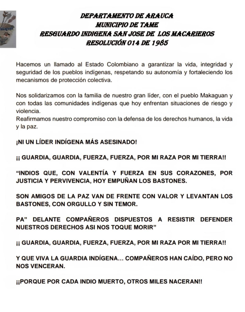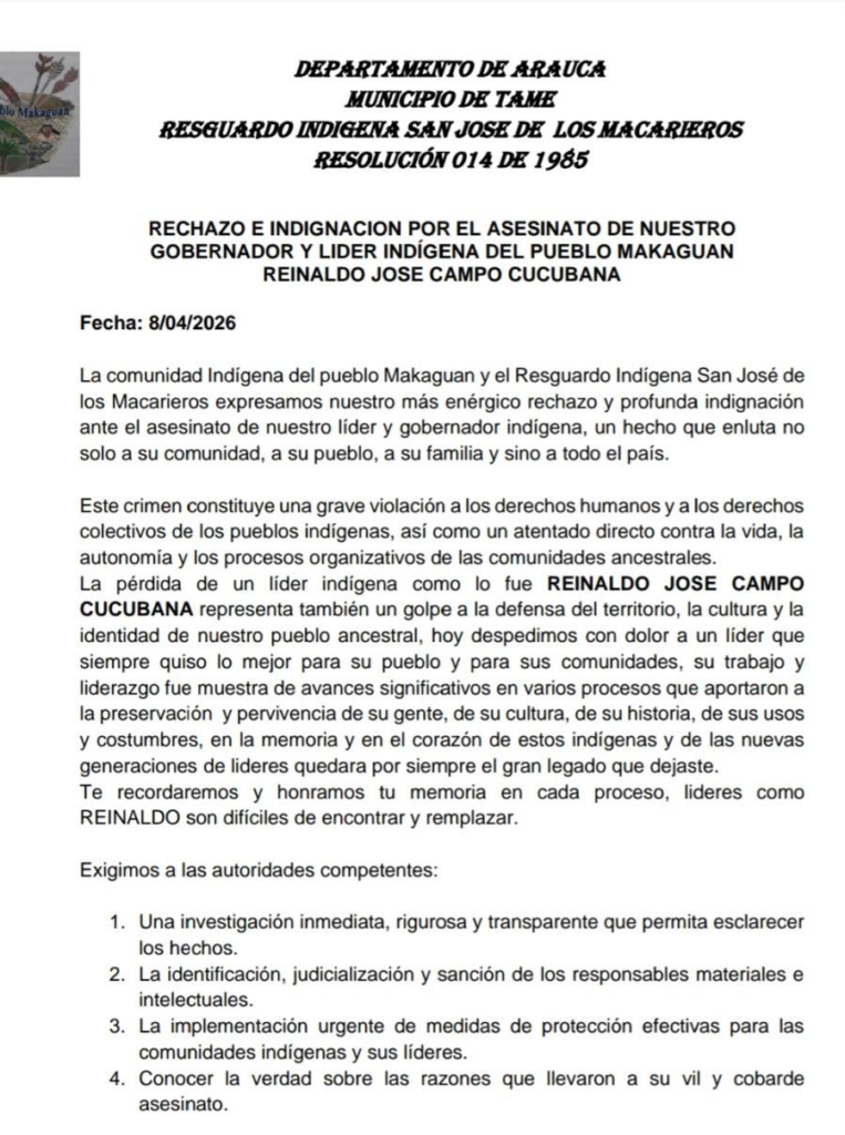Comunidades indígenas del pueblo Makaguan y del resguardo San José de los Macarieros rechazaron el asesinato del líder y gobernador Reinaldo José Campo Cucubana, ocurrido en el departamento de Arauca.