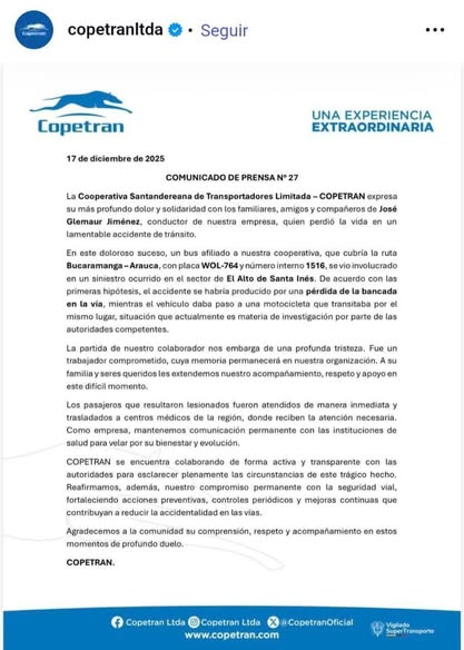 La Cooperativa Santandereana de Transportadores Limitada (Copetran) confirmó el fallecimiento de José Glemaur Jiménez, conductor de la empresa, tras un accidente de tránsito registrado en el sector de El Alto de Santa Inés, en la vía que comunica a Bucaramanga con Arauca.