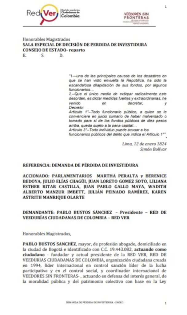 La Red de Veedurías Ciudadanas de Colombia presentó ante el Consejo de Estado una demanda de pérdida de investidura contra nueve congresistas, entre ellos la representante a la Cámara por Arauca, Karen Manrique, por su presunta participación en el escándalo de corrupción que involucra a la Unidad Nacional para la Gestión del Riesgo de Desastres (UNGRD).