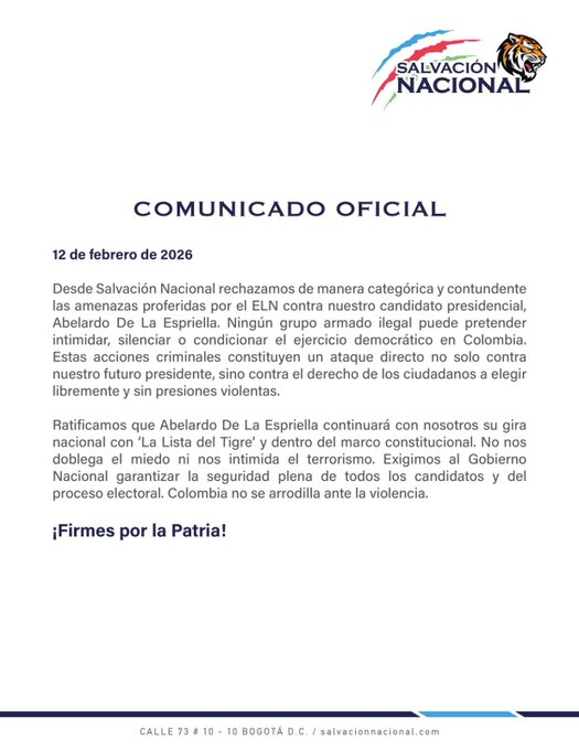 Y desde Salvación Nacional aseguraron: “Ningún grupo armado ilegal puede pretender intimidar, silenciar o condicionar el ejercicio democrático en Colombia.