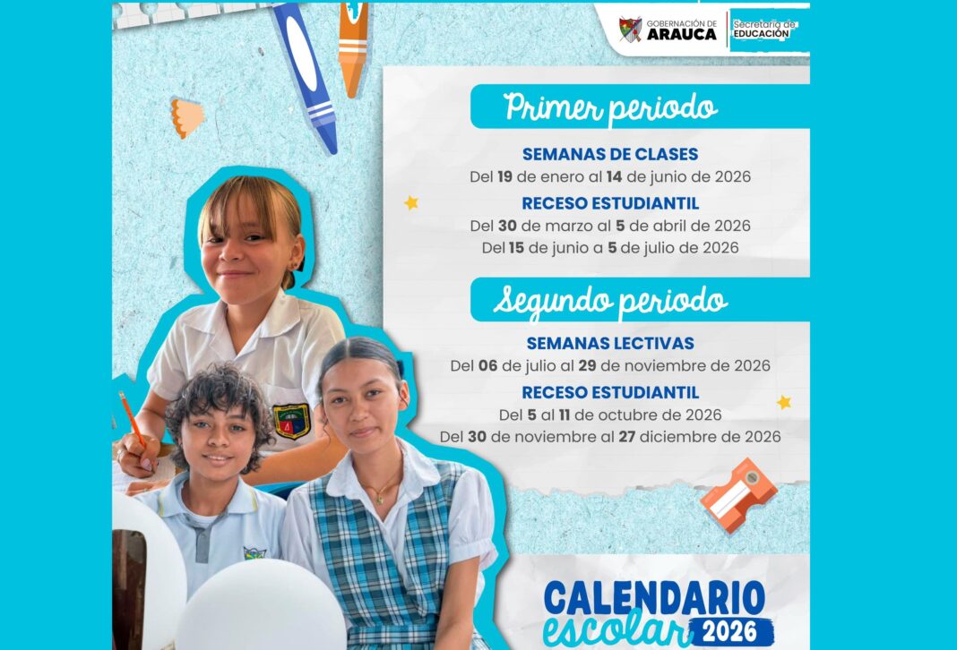 La Gobernación de Arauca, a través de la Secretaría de Educación Departamental, expidió la Resolución No. 4951 de 2025, mediante la cual se fija el calendario escolar y académico general para la vigencia 2026, aplicable a los establecimientos educativos oficiales y no oficiales de los municipios no certificados del departamento, en los niveles de preescolar, básica y media.