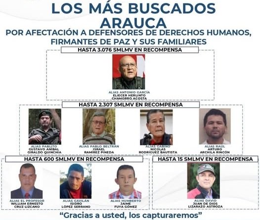 El Gobierno Nacional, a través del Ministerio de Defensa de Colombia, reveló el cartel de los integrantes más buscados del Ejército de Liberación Nacional en el departamento de Arauca, con recompensas que alcanzan varios miles de salarios mínimos por información que permita su captura.