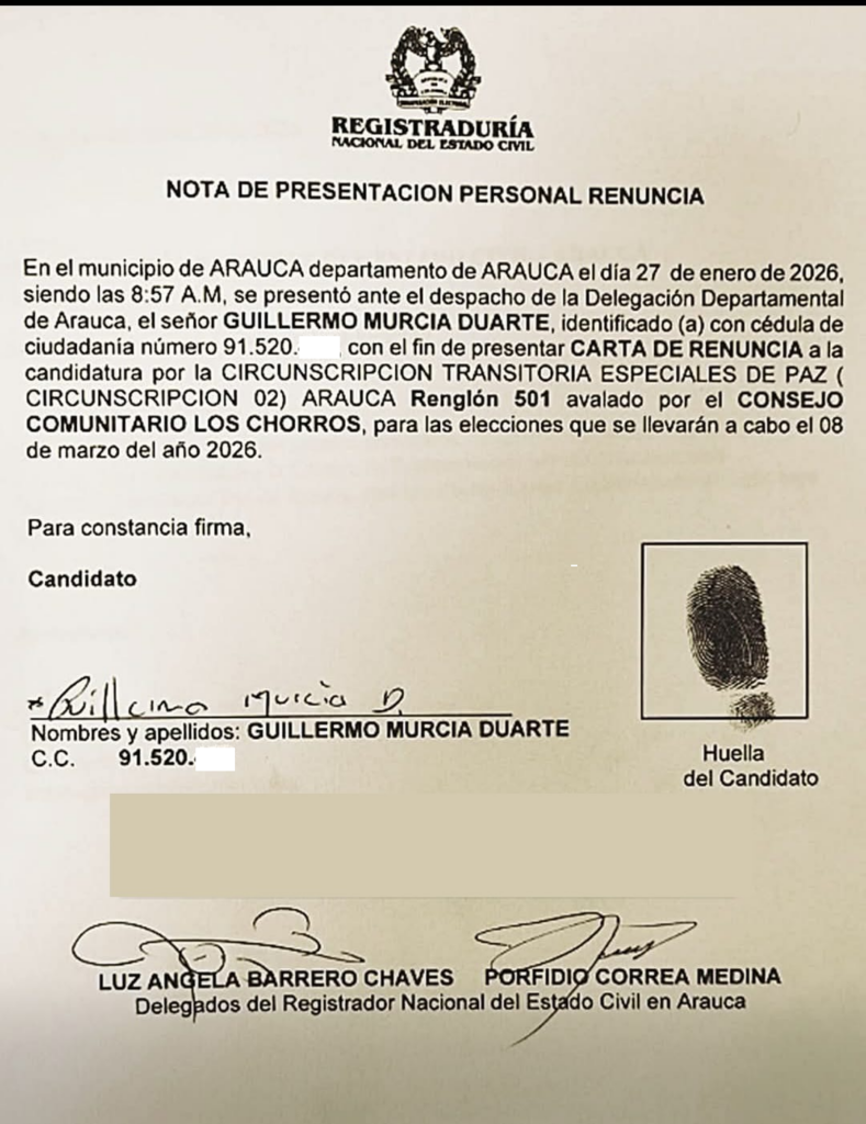 Guillermo Murcia Duarte, candidato del Consejo Comunitario Los Chorros a la Circunscripción Transitoria Especial de Paz (CITREP) para la Cámara de Representantes, oficializó su renuncia a la aspiración al Congreso de la República, en un hecho que sacude el escenario electoral del departamento de Arauca.