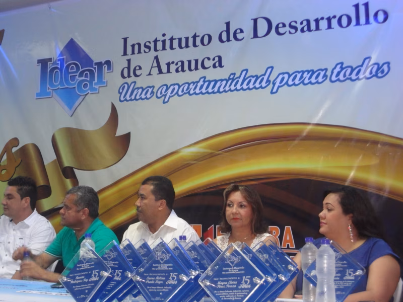 La gerente del Idear, Myriam Constanza Cristiano Núñez, durante su exposición ante los asistentes, reconoció el trabajo que para el año 1998 impulsaron los diputados, Cayo Mario Sepúlveda Escobar, Álvaro Hernández Romero, Diego Fermín Linares Castejón y Hernando Posso Parales, quienes acompañados del entonces gobernador de Arauca, Gustavo Carmelo Castellanos Beltrán, Q.E.P.D, estructuraron lo que es hoy el Instituto de Desarrollo de Arauca. Los personajes en vida, recibieron de la gerente y el gobernador el reconocimiento a esa labora con la entrega de una placa.