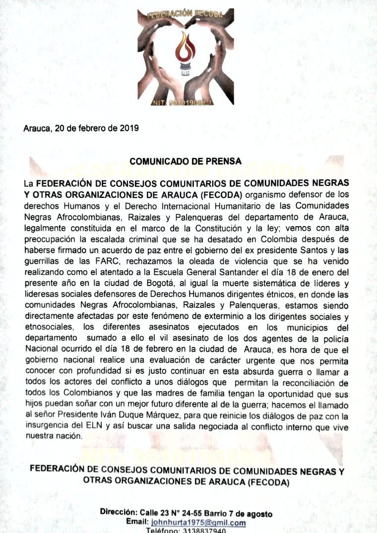 De otra parte, la Federación de Consejos Comunitarios de Comunidades Negras y otras Organizaciones de Arauca – FECODA, también se pronunció frente a la ola de violencia que azota el departamento y el país, pidiendo al gobierno nacional que considere continuar los diálogos de paz, a fin de acabar con esta violencia que ha recrudecido en los últimos días, sobre todo en el departamento de Arauca, un territorio geoestratégico para los grupos armados organizados, dadas las condiciones de frontera.