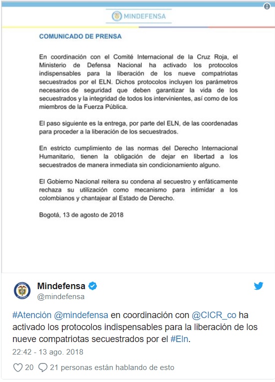 A través de un comunicado el Ministerio de Defensa aseguró, están listos los protocolos para que junto con el Comité Internacional de la Cruz Roja se realice la liberación de estas nueve personas que fueron secuestradas por esta guerrilla durante los últimos días.