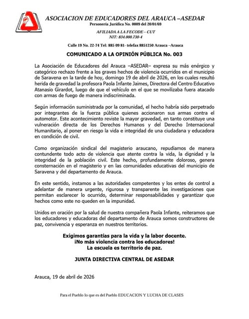 La Asociación de Educadores de Arauca (Asedar) calificó el hecho como “profundamente doloroso” y expresó su rechazo categórico, señalando que el vehículo en el que se movilizaba la docente fue atacado de manera indiscriminada. Según versiones de la comunidad recogidas por el gremio, el caso podría comprometer a integrantes de la fuerza pública, lo que —de confirmarse— constituiría una grave vulneración a los derechos humanos y al derecho internacional humanitario.