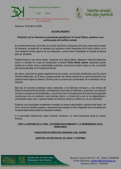 En la misma línea, la Fundación de Derechos Humanos Joel Sierra denunció presuntas irregularidades ocurridas tras el atentado con explosivos contra uniformados en el barrio La Esperanza. De acuerdo con su informe, luego del ataque se habrían presentado acciones de la fuerza pública contra civiles, entre ellas disparos contra el vehículo en el que se transportaba la docente, quien sufrió heridas de gravedad en cabeza, tórax y extremidades.
