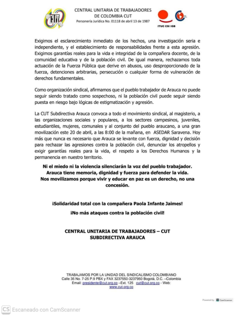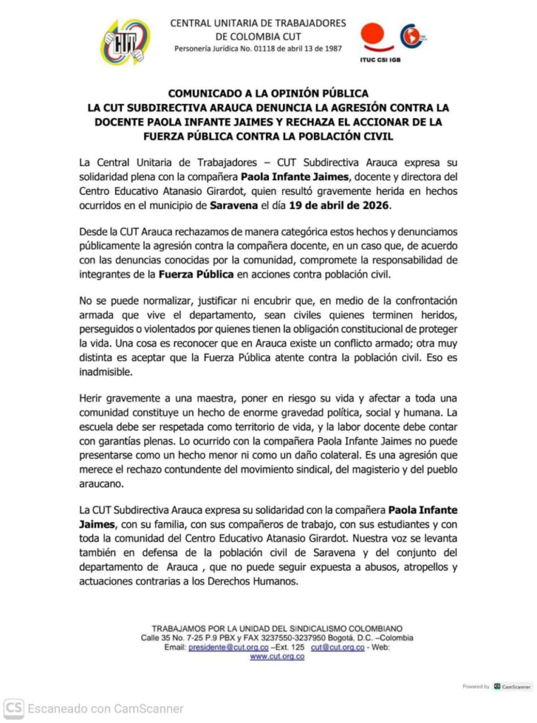 Por su parte, la Central Unitaria de Trabajadores (CUT) subdirectiva Arauca rechazó el ataque y advirtió sobre posibles responsabilidades de agentes estatales, insistiendo en que “la violencia no puede normalizarse” ni justificarse en medio del conflicto armado.