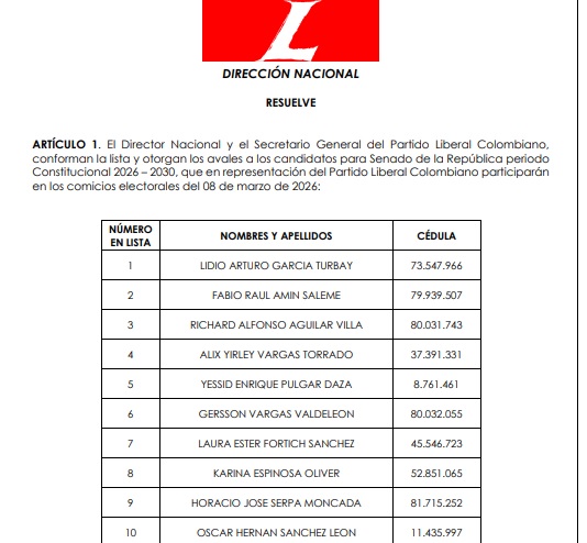 El Partido Liberal presentó su lista de candidatos para el Senado, para las elecciones legislativas que se celebrarán el 8 de marzo del 2026.