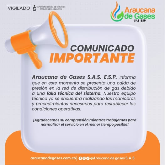Desde el pasado martes 23 de diciembre se presenta una falla en el servicio de gas domiciliario en el municipio de Arauca, situación que hasta este viernes no ha sido superada y que ha generado inconformidad entre los usuarios, quienes aseguran no haber recibido una explicación clara por parte de la empresa Araucana de Gases.