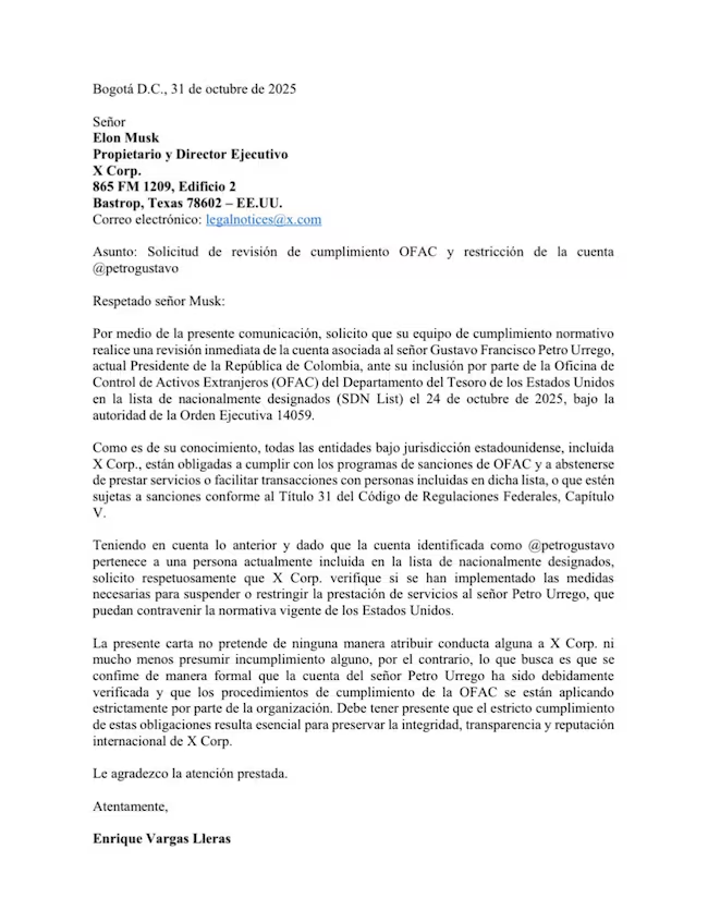 El expresidente de la junta de la Cámara de Comercio de Bogotá indicó que “todas las entidades bajo jurisdicción estadounidense, incluida X Corp., están obligadas a cumplir con los programas de sanciones de OFAC y a abstenerse de prestar servicios o facilitar transacciones con personas incluidas en dicha lista. Teniendo en cuenta lo anterior y dado que la cuenta identificada como @petrogustavo pertenece a una persona actualmente incluida en la lista de nacionalmente designados, solicito respetuosamente que X Corp. verifique si se han implementado las medidas necesarias para suspender o restringir la prestación de servicios al señor Petro Urrego”.