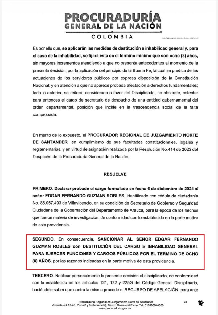 La decisión es de primera instancia, por lo que contra ella proceden los recursos de ley, mientras el caso se convierte en uno de los episodios disciplinarios más delicados que involucran a un exalto funcionario del Gobierno departamental de Arauca.