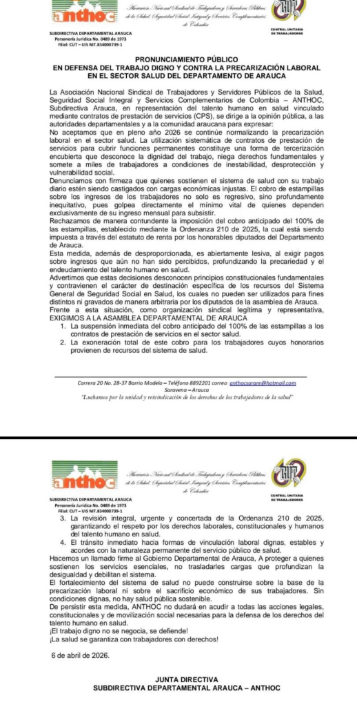 Las subdirectivas en Arauca de ANTHOC y la Central Unitaria de Trabajadores rechazaron la implementación del cobro anticipado del 100 % de estampillas a contratistas del sector salud, establecido en la Ordenanza 210 de 2025.