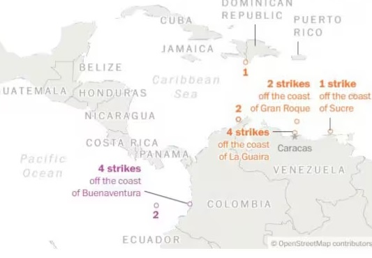 Según un mapa revelado por The Washington Post, Estados Unidos habría realizado en los últimos días 19 ataques a narcolanchas, en el caribe y el pacifico.