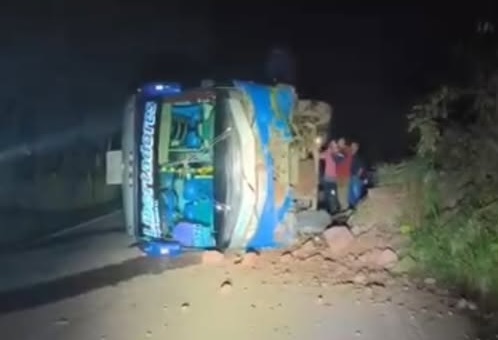 En la madrugada de este 24 de diciembre, un bus de la empresa Libertadores, identificado con el número interno 8022, sufrió un volcamiento lateral en la vía de la Soberanía, quedando sobre la calzada.